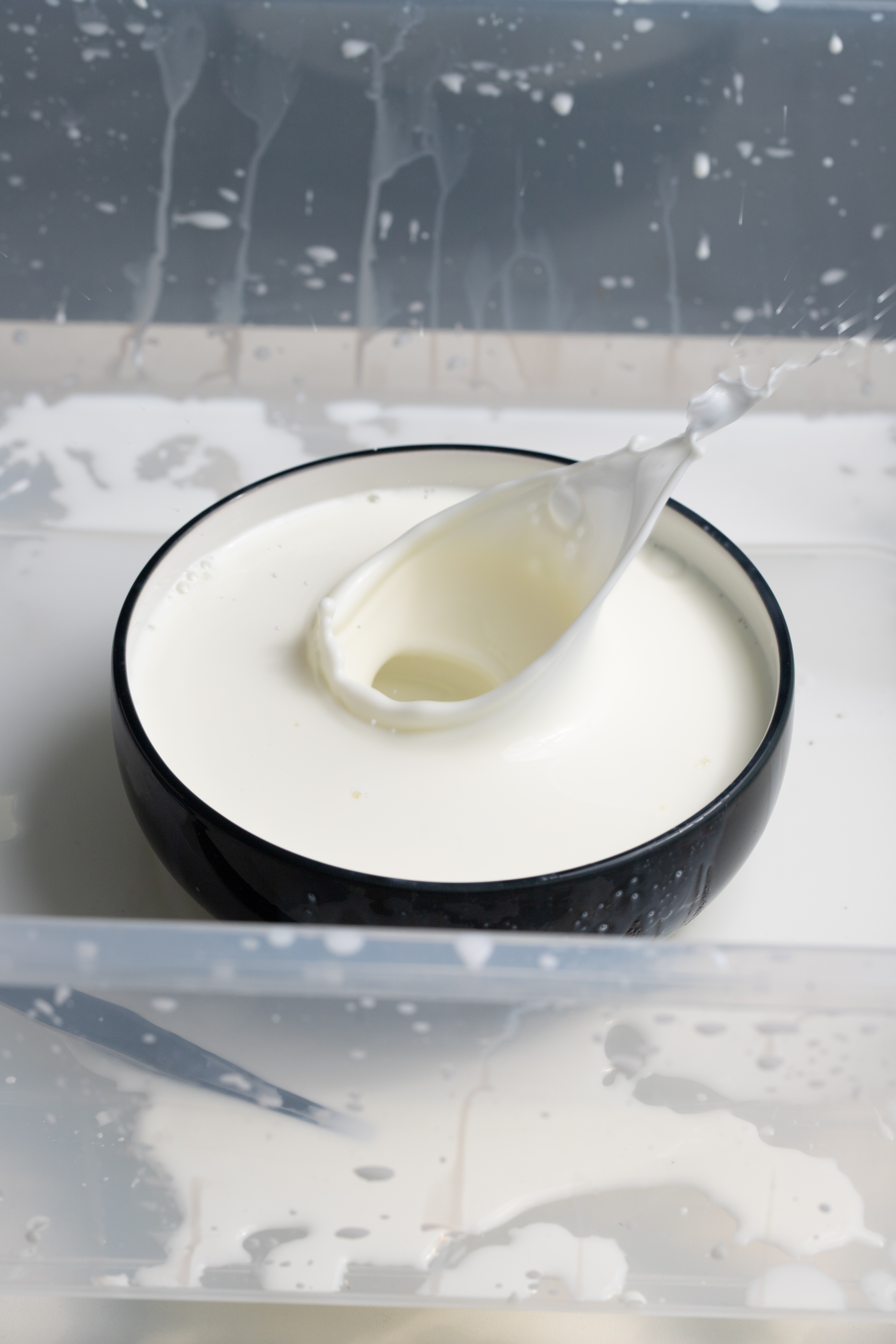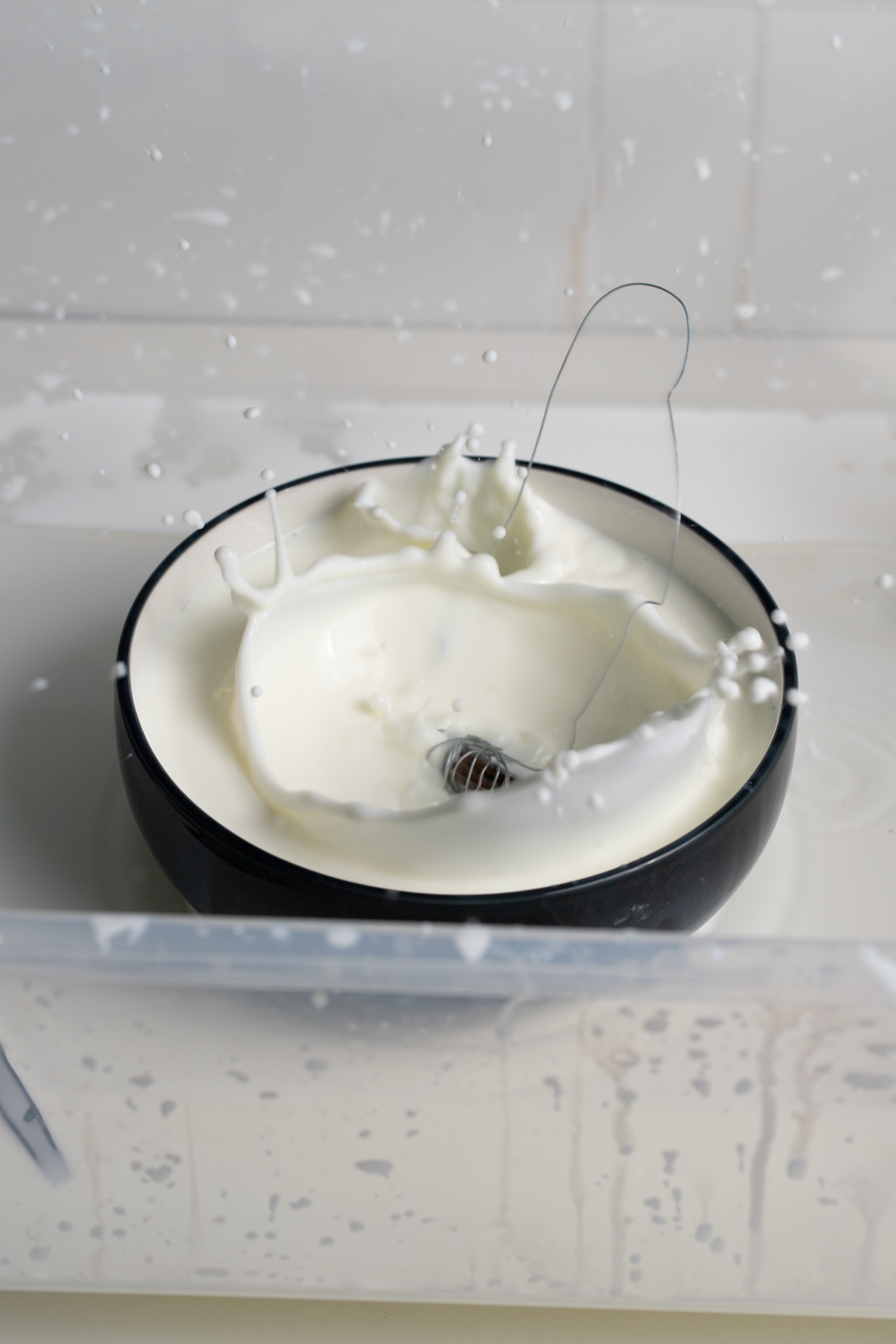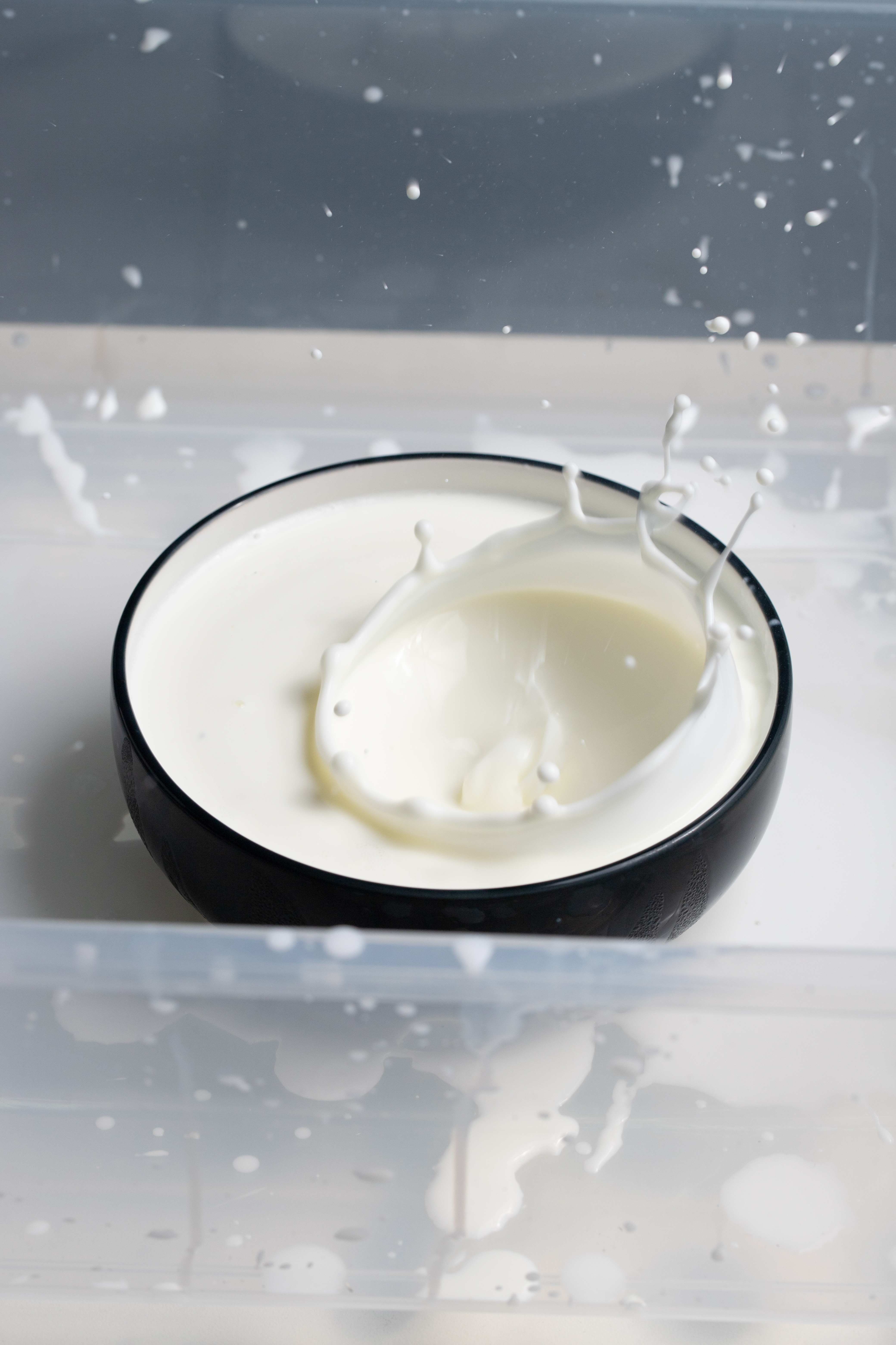 จากนั้นเราเซตฉากเป็นขาวหรือดำ เพื่อให้ง่ายต่การไดคัท เตรียมภาชนะเป็นแก้ว หรือถ้วย เทนมให้เต็ม แล้วหาวัตถุปล่อยจากที่สูงลงไปในภาชนะ ผมใช้เป็นเหรียญสิบ เพื่อให้เกิดการกระจายของนม แล้วกดชัตเตอร์ในทันก่อนที่การกระจายของนมจะหมดไป ซึ่งอาจจำเป็นต้องถ่ายซ้ำไปเรื่อยๆ จนกว่าจะได้ milk splash ที่สวยงาม