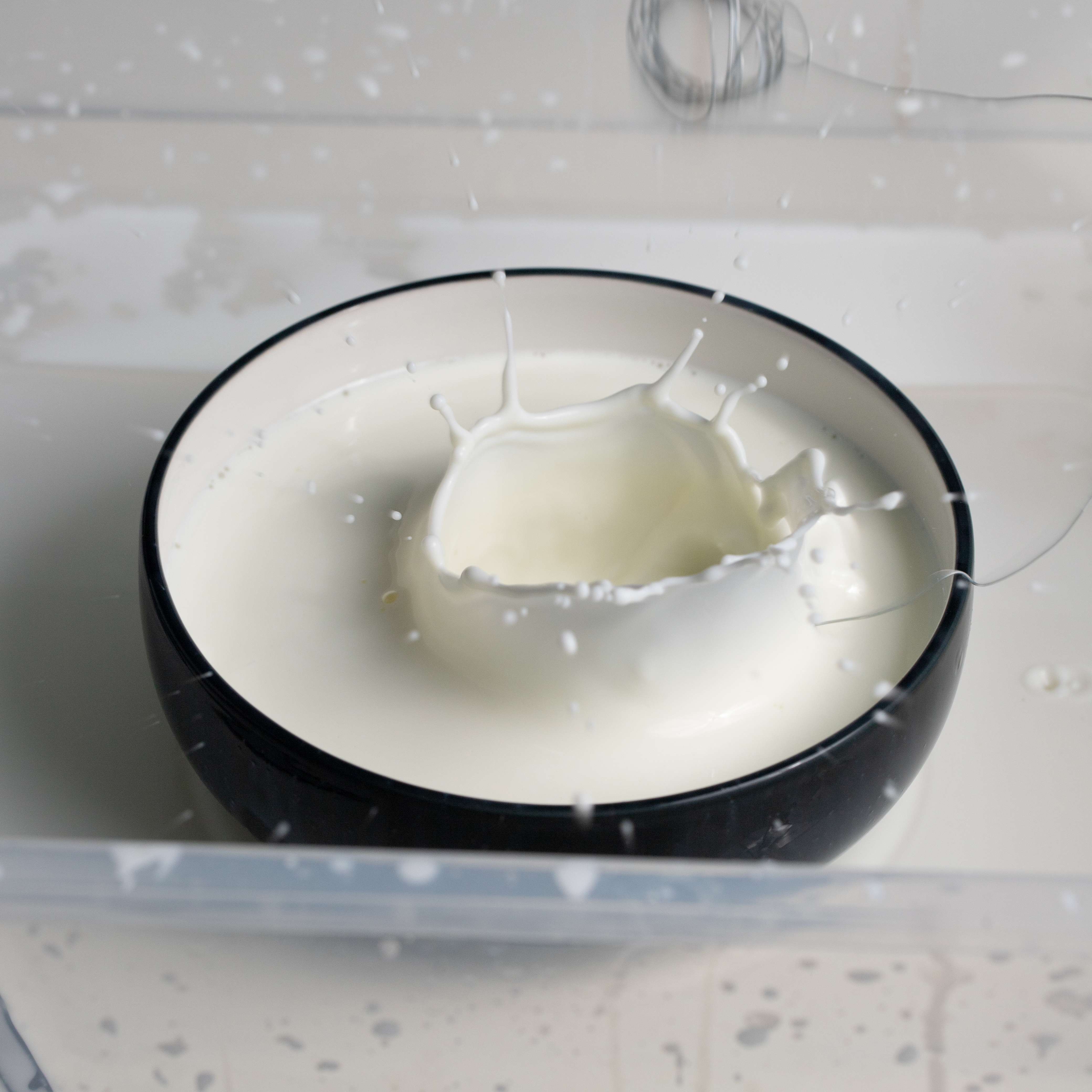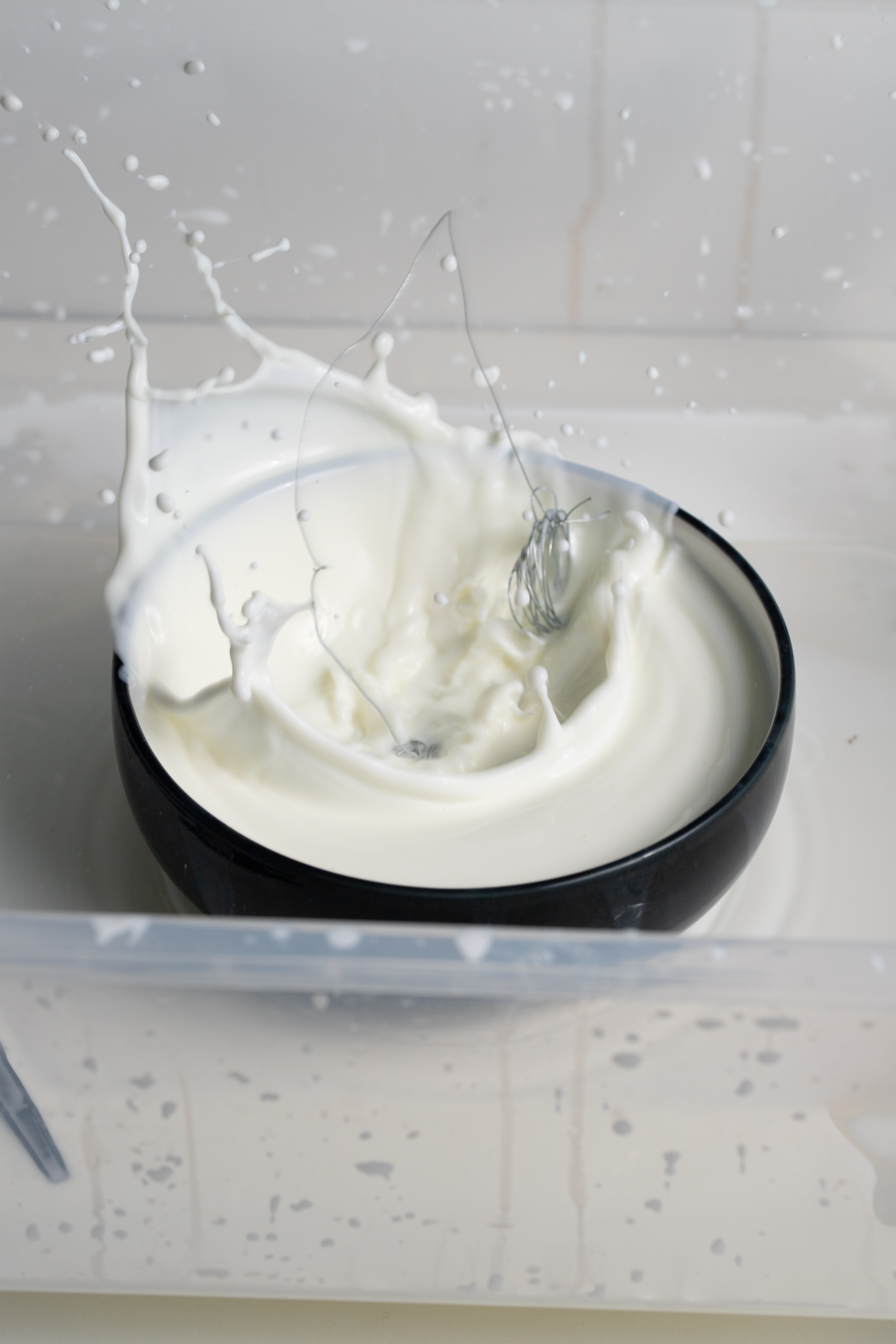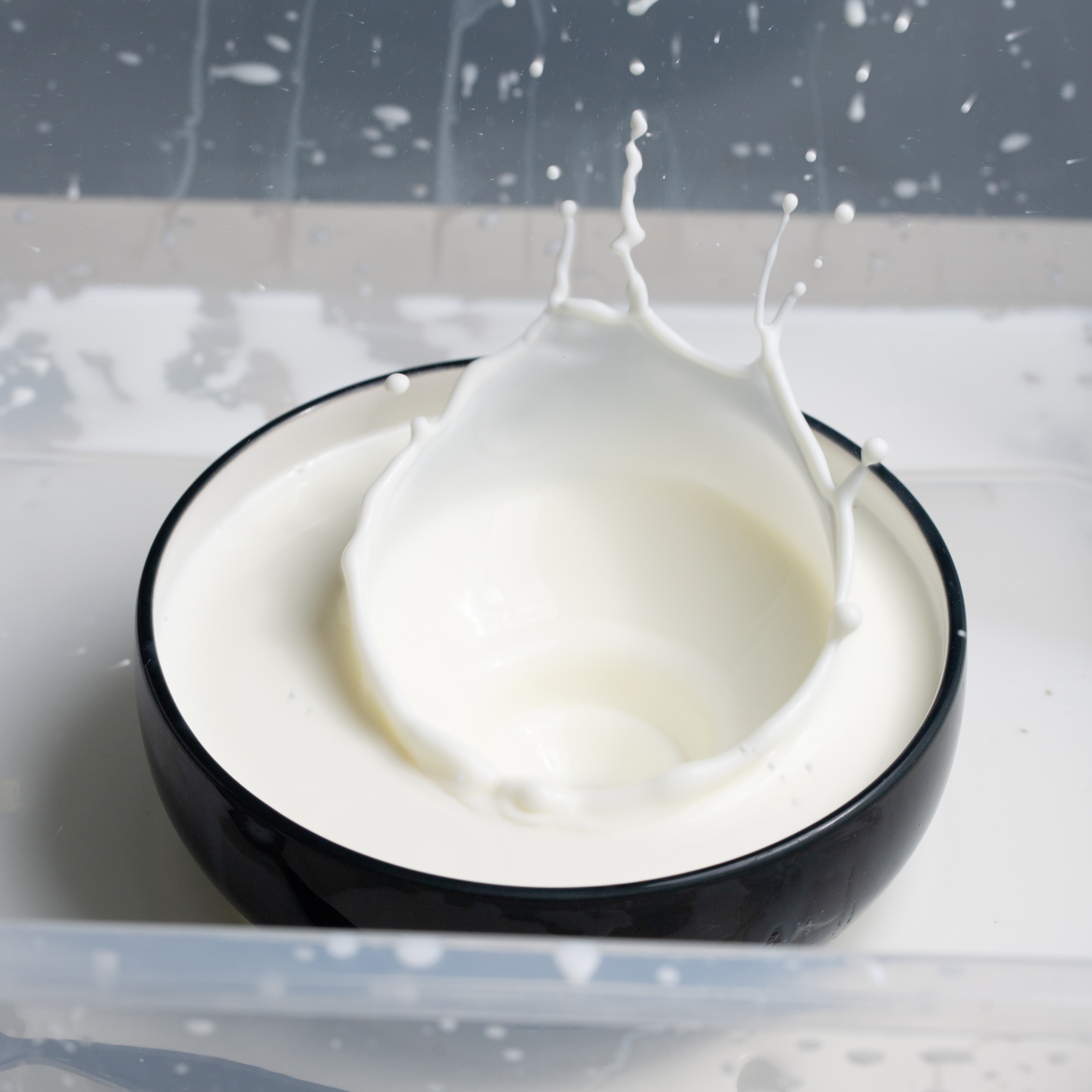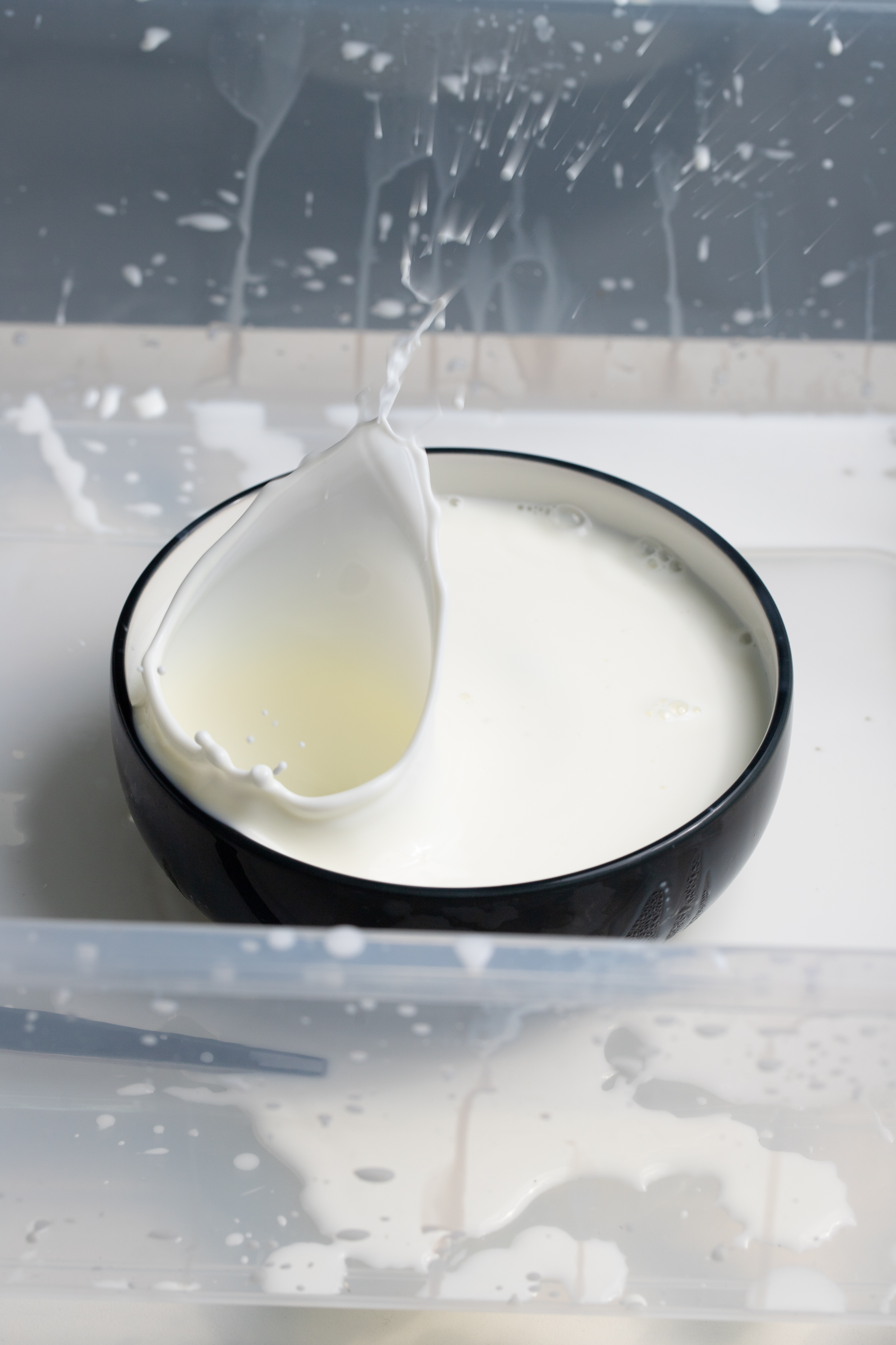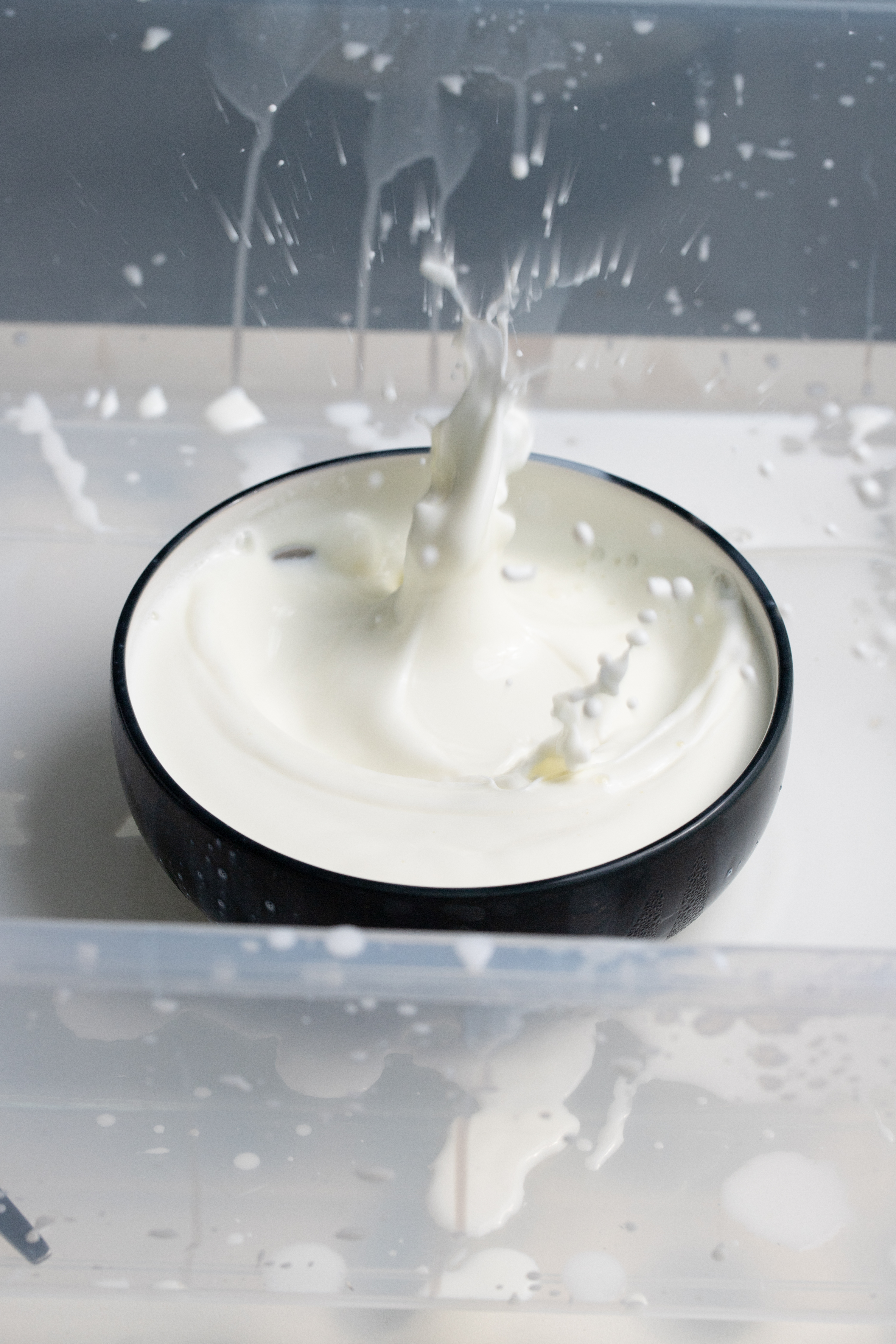 milk splash คือการถ่ายภาพแบบเดียวกับการถ่ายภาพกีฬา เพื่อให้วัตถุอยู่กับที่ โดยใช้สปีดชัตเตอร์เข้ามาควบคุม วิธีง่ายๆ คือการถ่ายภาพกลางแดด ซึ่งมีปริมาณแสงที่สูงมาก ทำให้เราสามารถดันสปีดชัตเตอร์ได้ที่ 400+ ซึ่งจะหยุดวัตถุที่ตกลงมา หรือหากถ่ายในสตูดิโอ ให้ใช้แสงแฟลชแบบ speedlight ในยี่ห้อธรรมดาจะดันสปีดชัตเตอร์ได้ไม่เกิน 125 แล้วแต่รุ่น แต่ถ้าใครมี speedlight ที่สามารถใช้ high speed sync ก็จะยิ่งดี แต่สำหรับคนที่งบไม่สูง สปีดชัตเตอร์ที่ 100 ก็เพียงพอ เพราะในความเป็นจริง แฟลชแบบ speedlight จะกระพิบไฟในช่วงเสี้ยววินาที เพียงพอที่จะหยุดหยดน้ำแบบ milk splash ได้